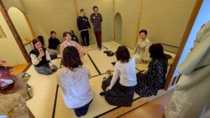 まずは座学として、お茶の歴史やお作法の説明。座り方、立ち方、心構えを学びました。